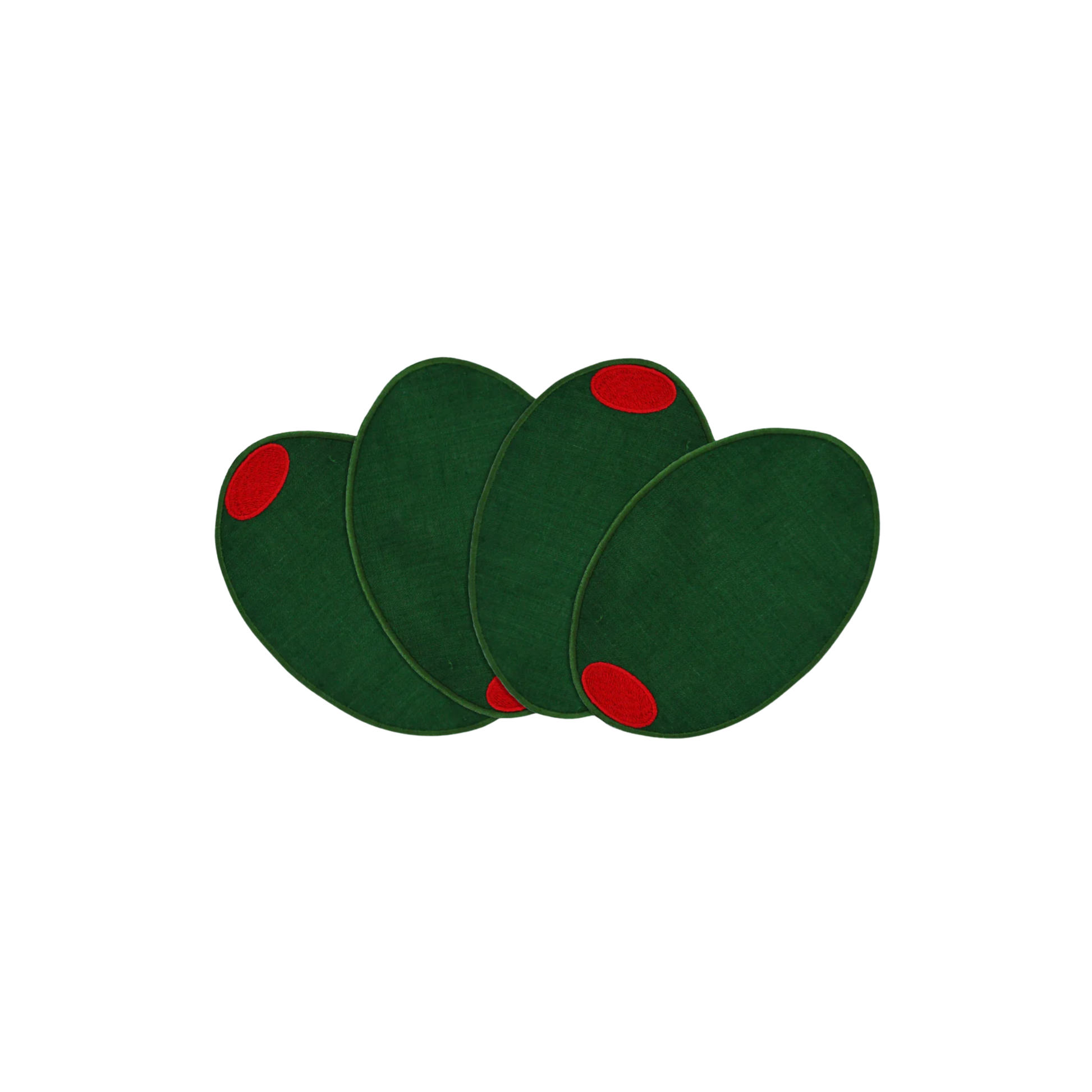 Cheers to martini lovers with these quirky cocktail napkins! Shaped like green olives, this set of 4 napkins is made from green linen. Handwash with delicate detergent and air dry (or dry clean) for a perfect martini-inspired touch to any gathering.
